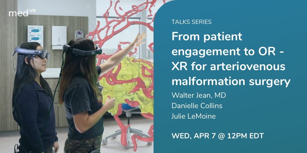Today 7-Apr 12:00 PM EDT Learn both the patient and neurosurgeon's experience using VR to treat an arteriovenous malformation (a tangle of abnormal blood vessels connecting arteries and veins.) Register to learn more. https://bit.ly/3mCsZdn